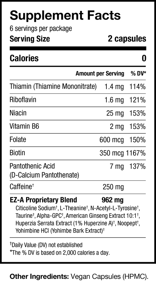 EZ-A from Illicit Labs key ingredient list: Citcoline, L-Theanine, L-Tyrosine, Taurine, Alpha GPC, Ginseng, Hupersine A, B Vitamins, Noopept, and Yohimbine